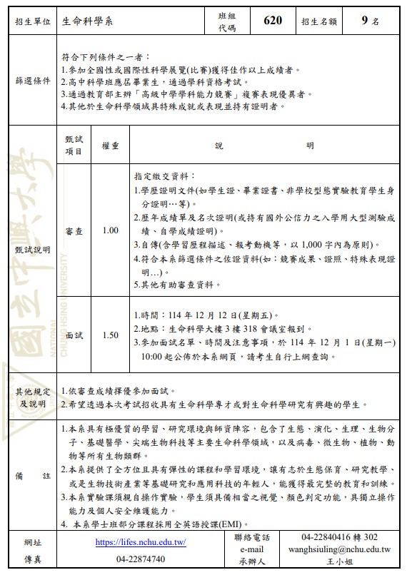 生命科學系招生員額:9名