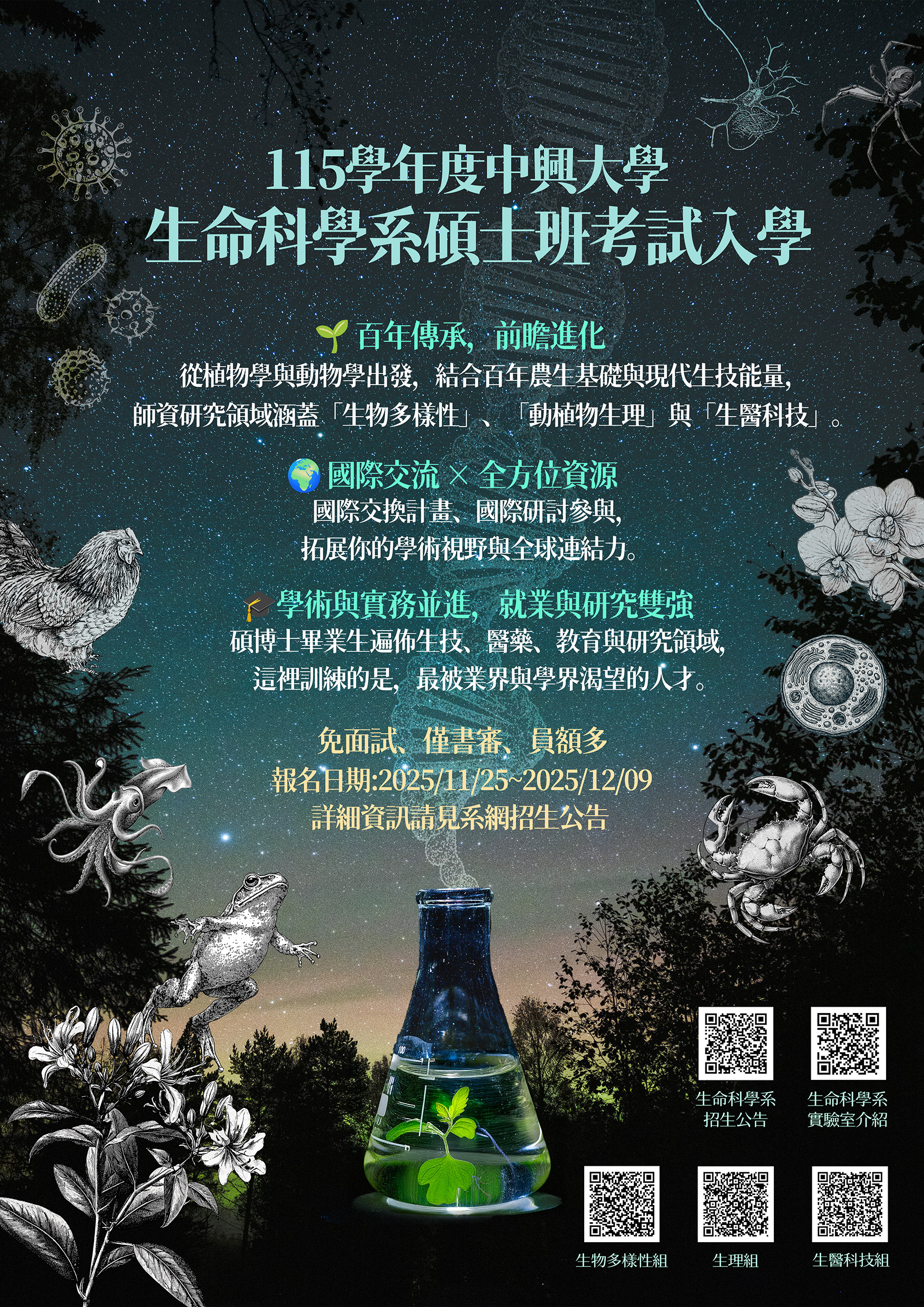 生命科學系招生員額: 甲組:一般生4名,在職生1名。 乙組:一般生4名,在職生1名。 丙組:一般生4名,在職生1名。 考試項目:書審【1.學歷證明文件。 2.歷年成績單(大學歷年成績單及名次證明)。 3.其他有利審查資料】