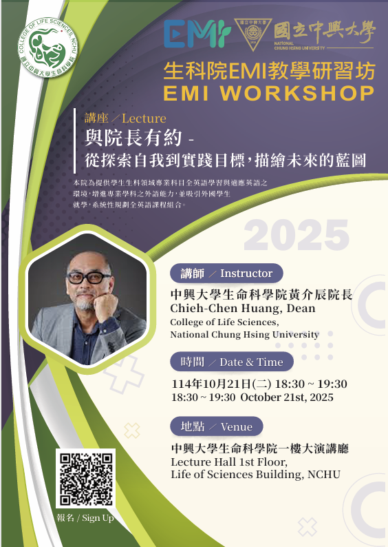 生科院EMI 於2025年10月21日(星期二)晚上6:30至7:30在演講廳舉辦與院長有約講座。