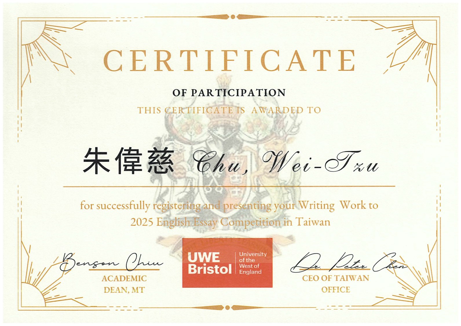 【賀】朱偉慈同學參加英國西英格蘭大學舉辦2025英文寫作大賽表現優異